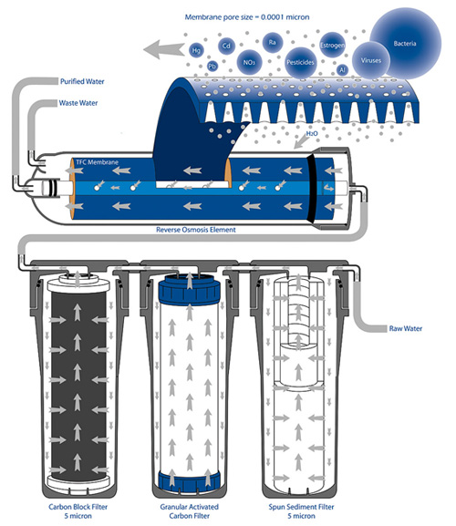 Reverse osmosis (RO) is a water purification technology which uses a semipermeable membrane to remove disolved minerals. If two solutions with different concentrations are separated by a semi permeable membrane, then the water from the weaker solution flows towards the concentrated solution to try and equalise the concentration. This is the natural OSMOTIC PHENOMENON.